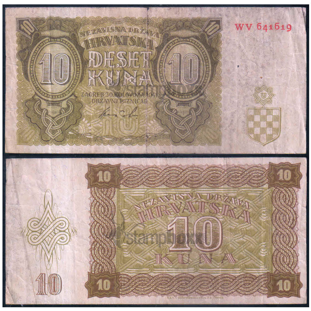 CROATIA 10 KUNA 1941 P-5 USED SERIAL 1619