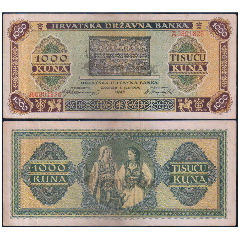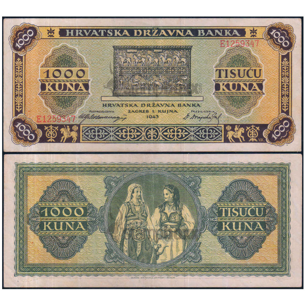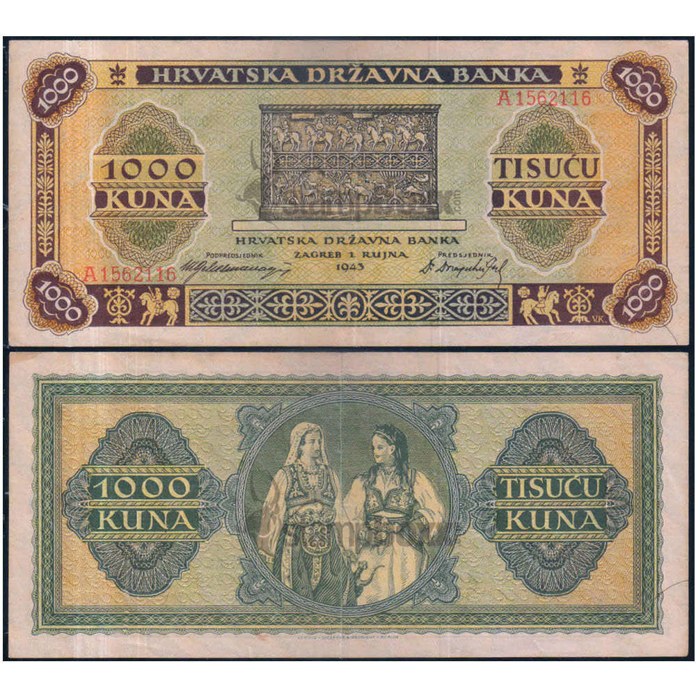 CROATIA 1000 KUNA 1943 P-12 XF (MIDDLE FOLD)